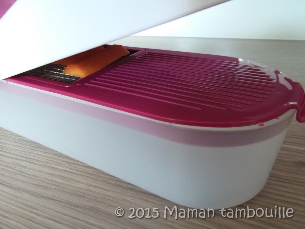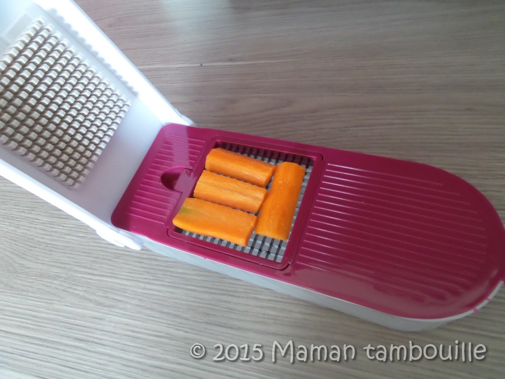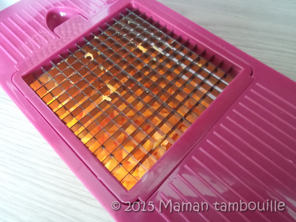 Je ne peux déjà plus me passer de cet ustensile et surtout de la petite grille pour faire des petits cubes, c’est le top pour émincer des oignons rapidement et sans pleurer, super pour faire des tartares de tomates interminables à réaliser avec un couteau, sympa pour faire des petits cubes de carottes et changer des carottes râpées et j’en passe, brunoise de pommes, gros dés de courgettes ou de pommes de terre …