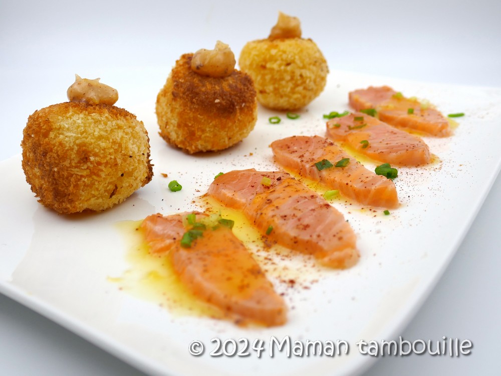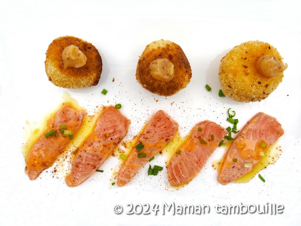 J’avais adoré cette recette réalisée il y a déjà plusieurs mois et qui était restée dans mes brouillons jusqu’à maintenant. Je l’avais repérée dans l’émission Tous en Cuisine et l’avais testée dans la foulée et j’avais eu raison car ce plat est vraiment très bon. Des boulettes de risotto safrané panées, du saumon mariné aux agrumes, une mayonnaise maison au paprika fumé, tout pour se régaler. Certes, c’est un peu long à préparer, surtout les boulettes de risotto mais allons, un peu de courage et c’est parti 😉