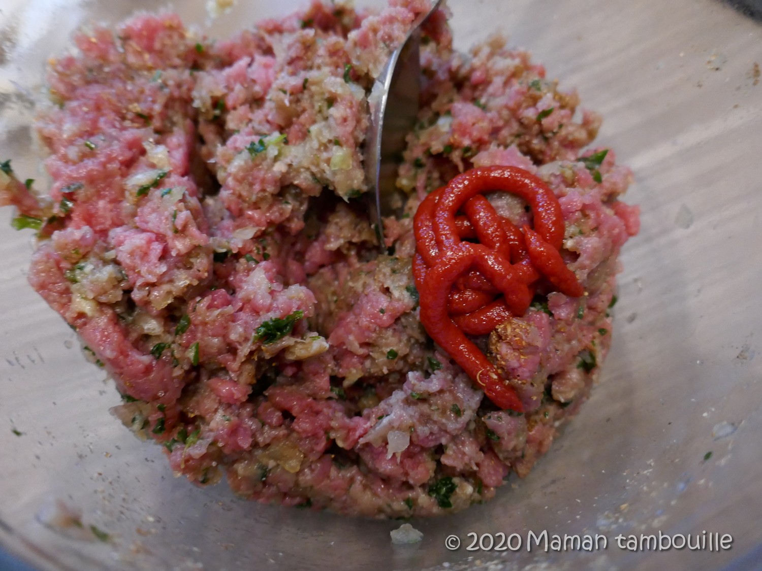 Une fois hachĂ©, ajouter le concentrĂ© de tomate, le sel, le cumin, le quatre Ă©pices et l’ail semoule. Bien mĂ©langer.