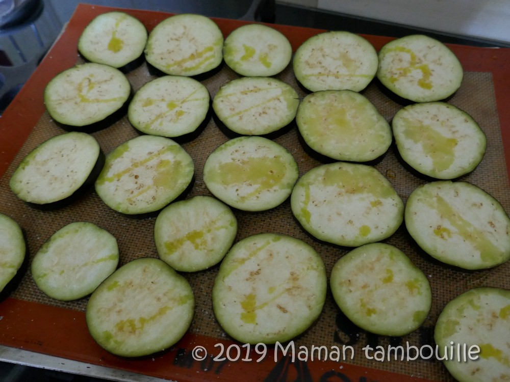 Préparer les aubergines: les couper en tranches de 7-8 mm. Les poser sur une silpat ou sur du papier cuisson. Saler puis verser un filet d’huile d’olive sur toutes les rondelles.