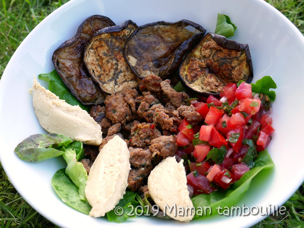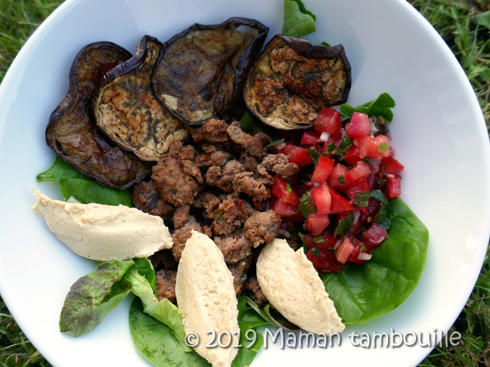 Humm, cette assiette était juste au top de ce que j’aime ! Du boeuf tiède bien assaisonné, des aubergines grillées au four, une salsa de tomates aux herbes du jardin et de l’houmous maison bien frais. Un régal pour les papilles qui rappelle les plats libanais.