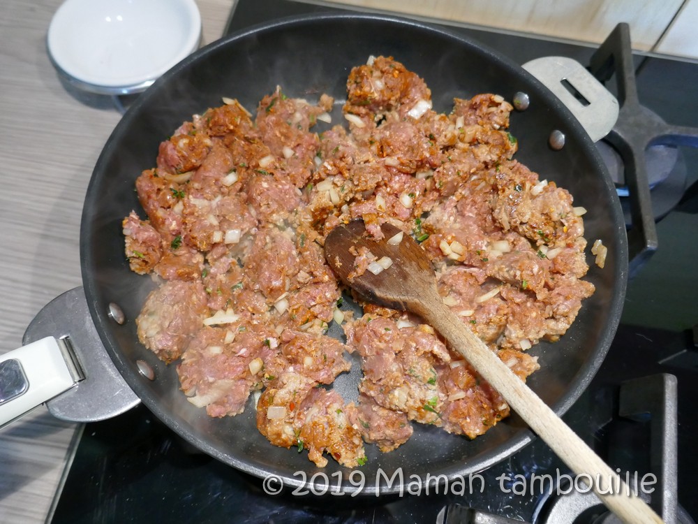 Dans un saladier, mélanger le boeuf, le sachet d’épices, l’oignon émincé, 6 cuillères à soupe de persil ciselé et 3 cuillères à soupe de menthe ciselée.