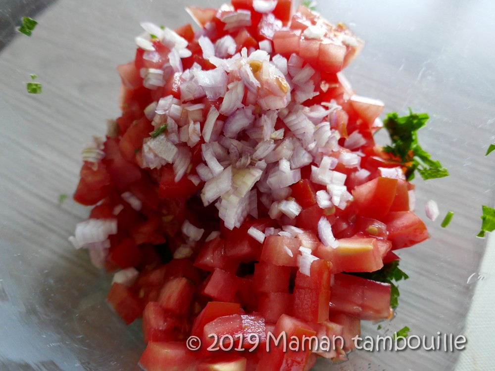 Emincer finement l’échalote. Mettre dans un saladier avec les tomates coupées en tout petits dés, 6 cuillères à soupe de persil ciselé et 3 cuillères à soupe de menthe ciselée.