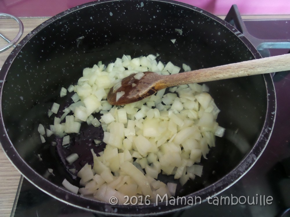 Emincer l’oignon et le faire revenir dans de l’huile d’olive. Laisser cuire en mélangeant jusqu’à ce qu’il soit translucide et fondant.