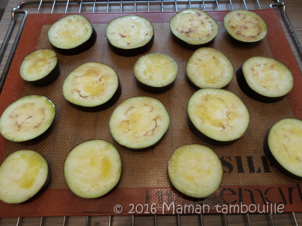 Laver les aubergines et les couper en rondelles d’1cm d’épaisseur. Les déposer sur une plaque de cuisson. Avec un couteau pointu bien coupant, faire des entailles légères sur les rondelles.