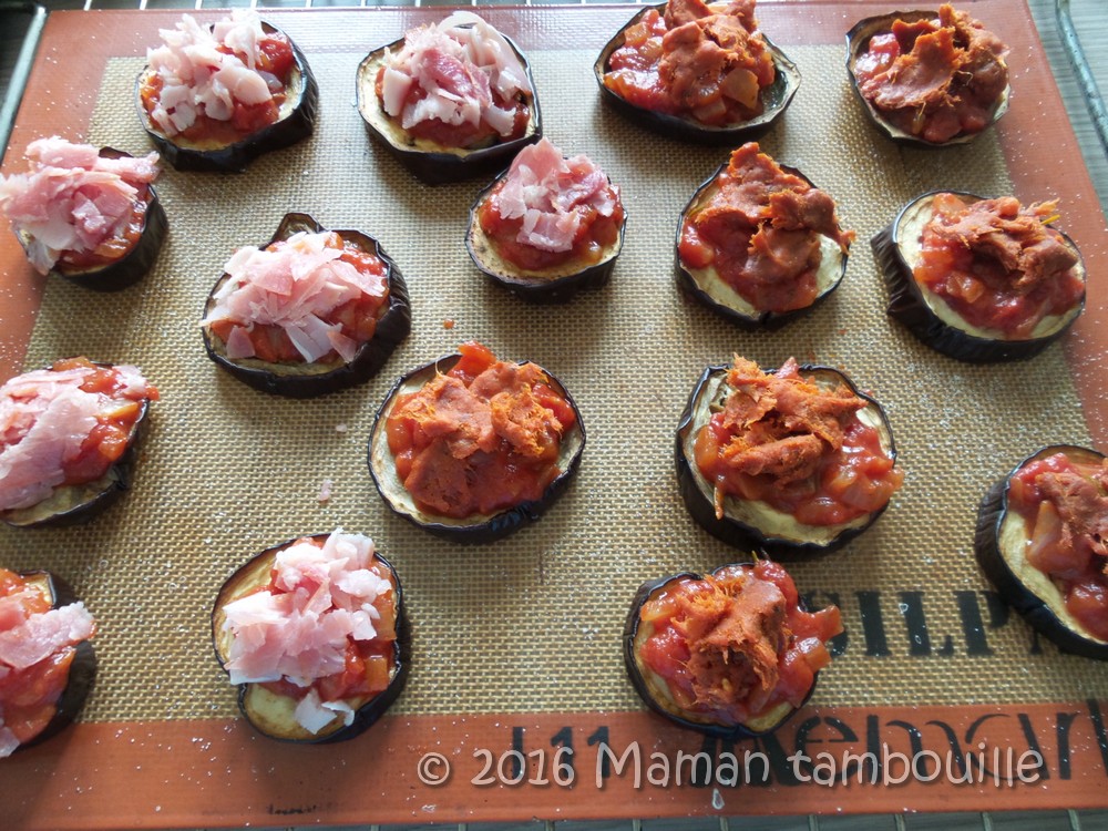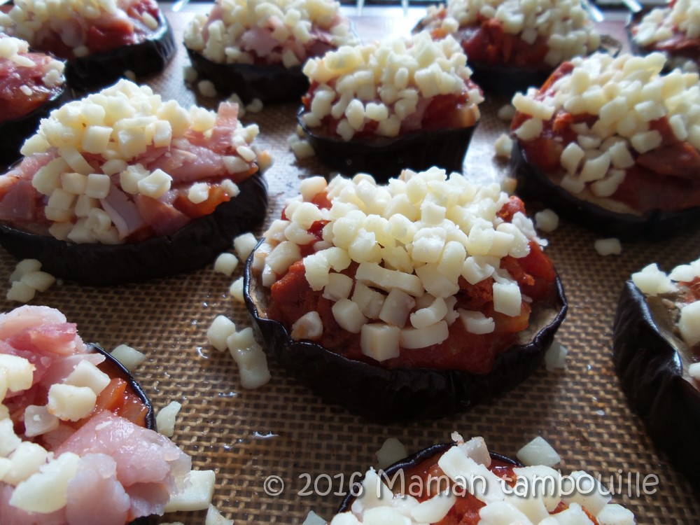 Voilà l’occasion parfaite pour essayer cette qui est dans ma to-do-list depuis belle lurette. Le principe de la recette est simple, la pâte à pizza est remplacée par des tranches d’aubergines cuites au four. Pour la garniture, on y met ce qu’on veut, une sauce tomate, du jambon, du fromage à pizza … Moi, j’en ai fait 2 versions, une avec bacon et fromage et l’autre avec soubressade (reçue dernièrement de société gastronomique ibérique) et fromage.