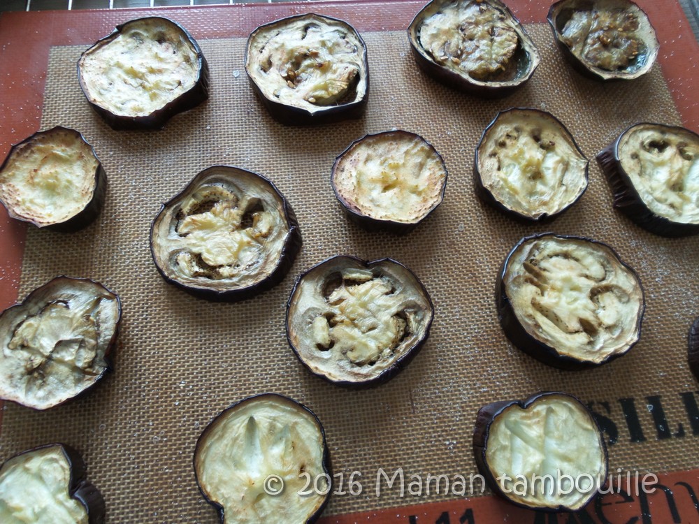 Laver les aubergines et les couper en rondelles d’1cm d’épaisseur. Les déposer sur une plaque de cuisson. Avec un couteau pointu bien coupant, faire des entailles légères sur les rondelles.