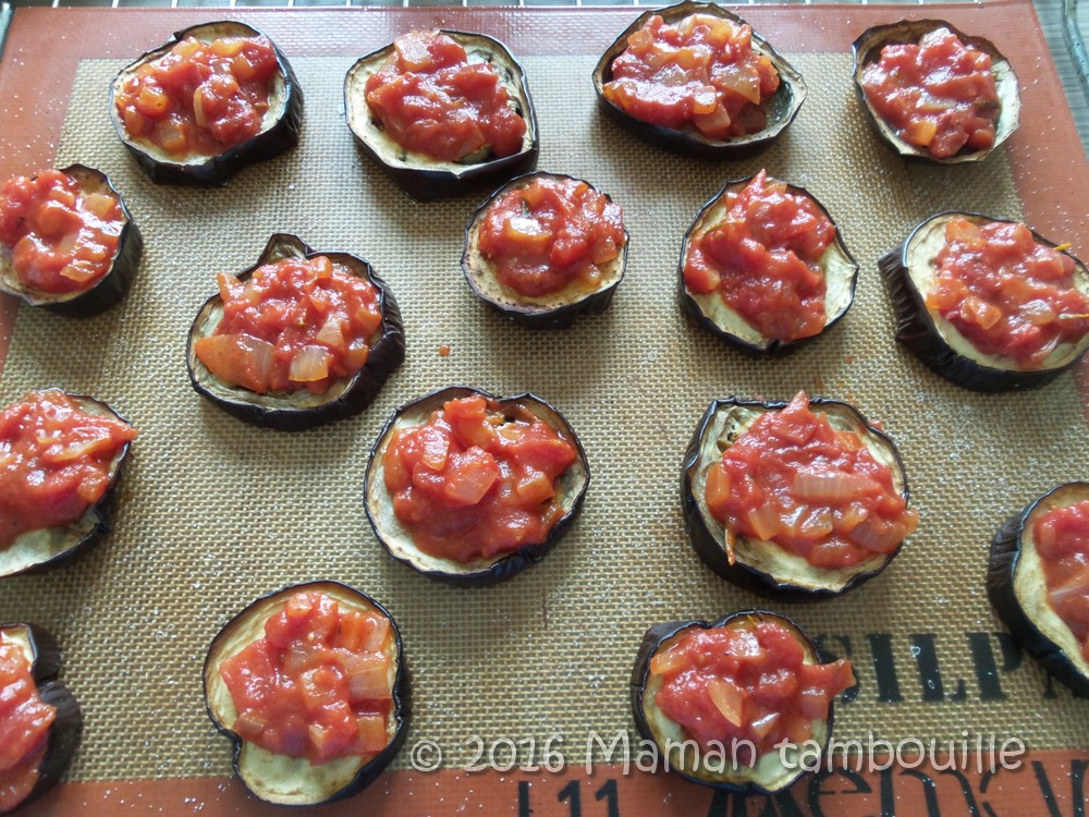 Déposer une cuillère de sauce tomate sur chaque rondelle.