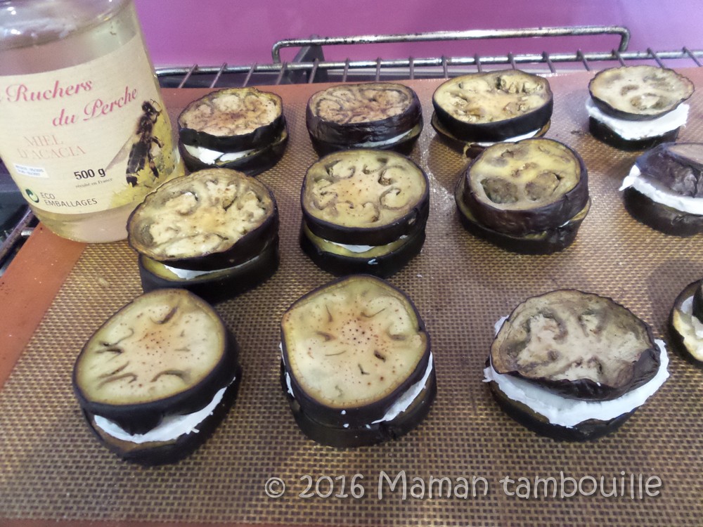 Sortir la plaque du four puis poser une tranche de chèvre sur la moitié des tranches. Refermer avec une autre tranche.
