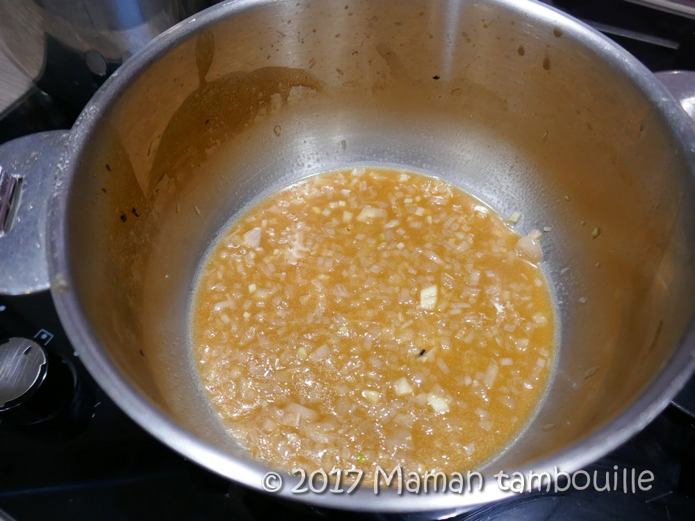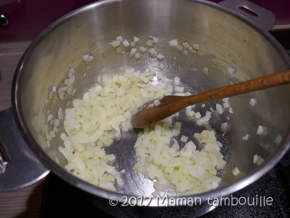 Dans une casserole, chauffer 1 cuillère à soupe d’huile l’olive et y faire revenir l’oignon finement émincé.