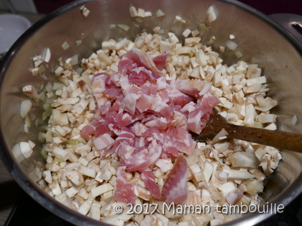 Ajouter les champignons et la poitrine fumée coupés en petits morceaux. Saler légèrement car la poitrine fumée apporte déjà du sel. Cuire une quinzaine de minutes jusqu’à évaporation du jus de cuisson.