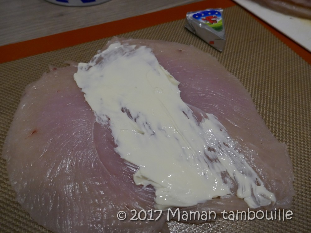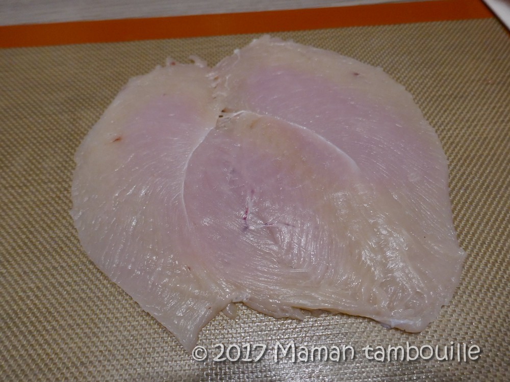 Ouvrir chaque blanc de poulet en 2 et les poser sur un film alimentaire (ou une silpat). Poser une seconde feuille de film sur le poulet puis taper dessus avec un rouleau à pâtisserie pour agrandir l’escalope et la rendre fine.