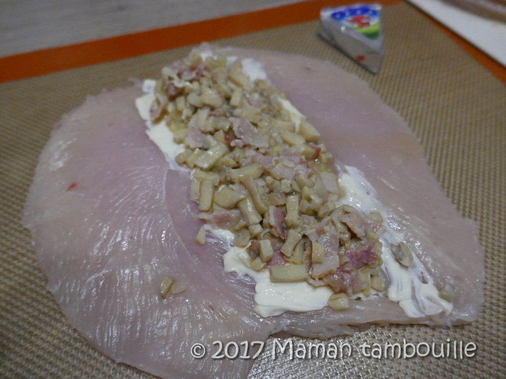 Déposer 2 belles cuillères à soupe de champignons sur le poulet.