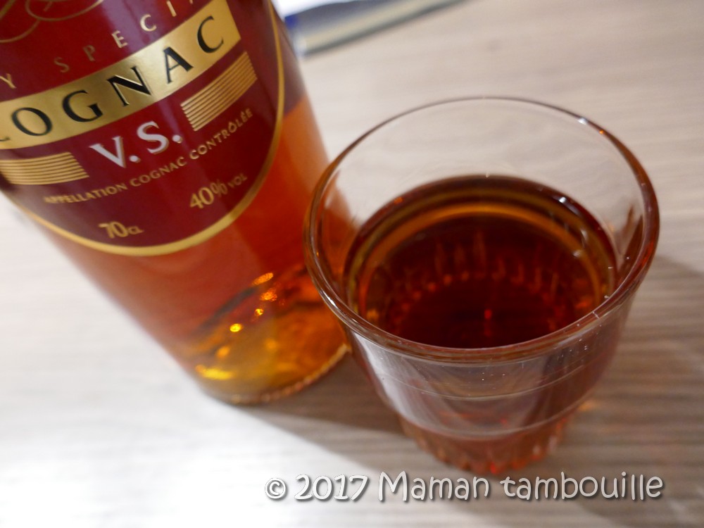 Hors du feu et hotte éteinte, verser un petit verre de cognac.