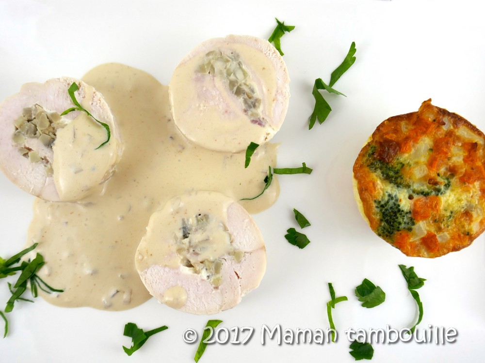 J’aime beaucoup les ballotines de poulet. On les farcit comme on veut et, avec le mode de cuisson en ballotine dans l’eau, la viande est bien tendre et pas sèche. Le tout nappé d’une petite sauce crémée au cognac et accompagné de mes petits flans de légumes, humm, c’est trop bon.