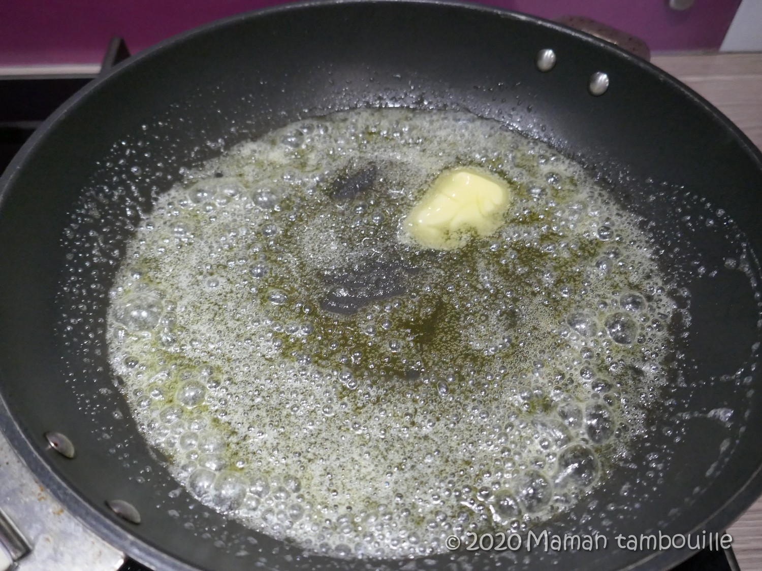 Chauffer 40g de beurre et 4 cuillères à soupe d’huile d’olive dans une poêle.