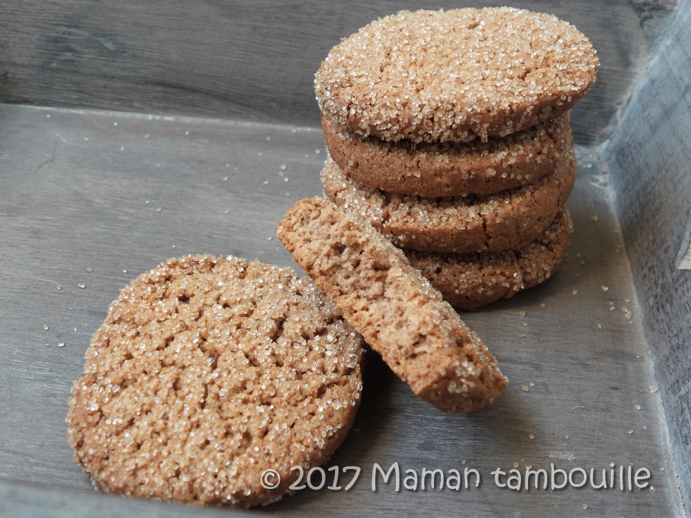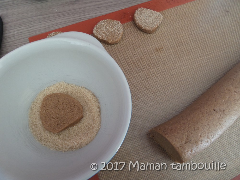 Préparer un bol avec du sucre blond et y déposer un à un les biscuits pour les couvrir de sucre sur une face seulement.