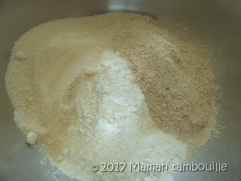 Dans un saladier, mélanger les farines, la levure, 100g de sucre et le sel