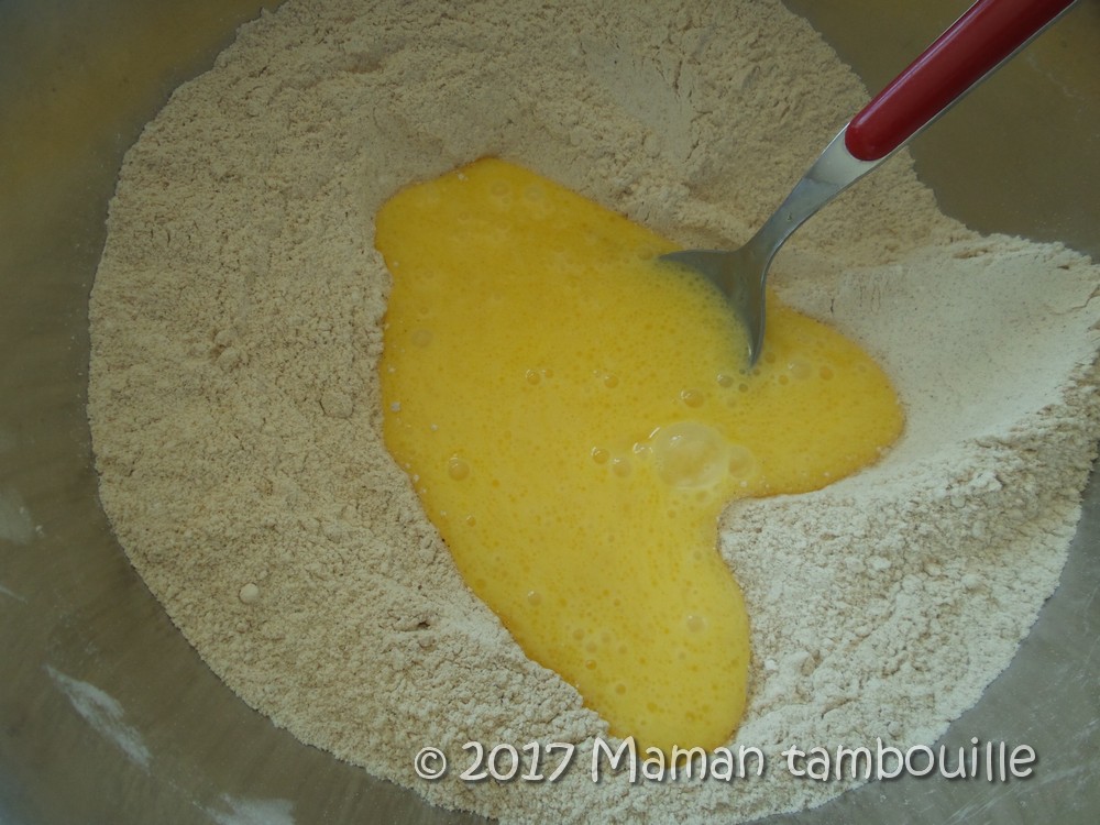 Verser le mélange d’oeuf dans la farine et commencer à mélanger avec une cuillère.