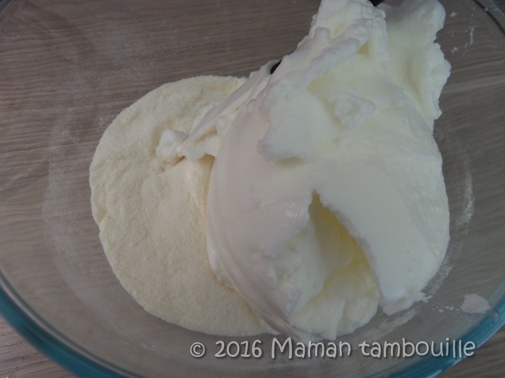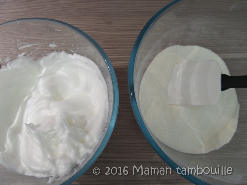 Verser les blancs en neige dans le mélange farine/sucre.