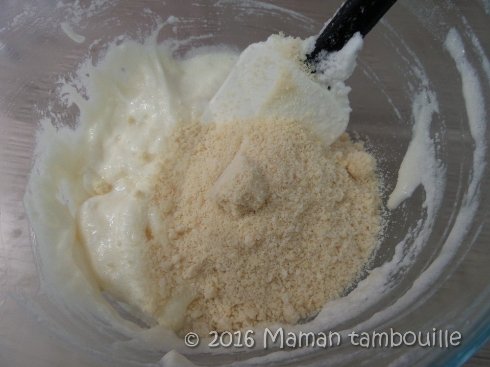 Incorporer délicatement avec une spatule puis ajouter la poudre d’amande. Mélanger.