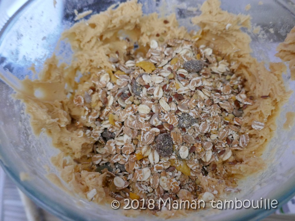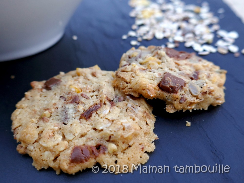 Ces biscuits étaient vraiment trop bons. A base d’un mélange de farine et de muesli, ils sont très gourmands. En y ajoutant de les morceaux de pralinoise, les voilà même très addictifs.