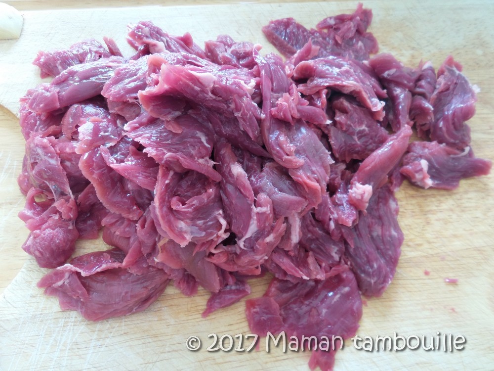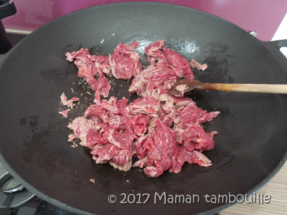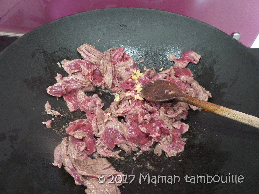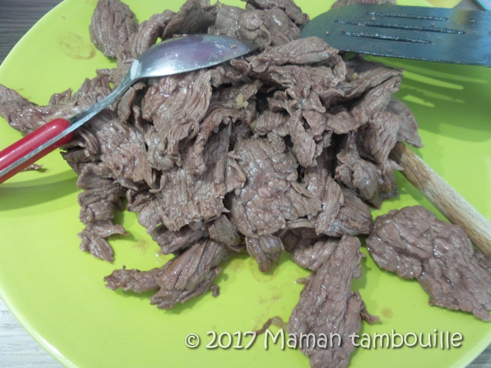 Quand le boeuf est bien saisi, le réserver dans une assiette et jeter le jus de cuisson.