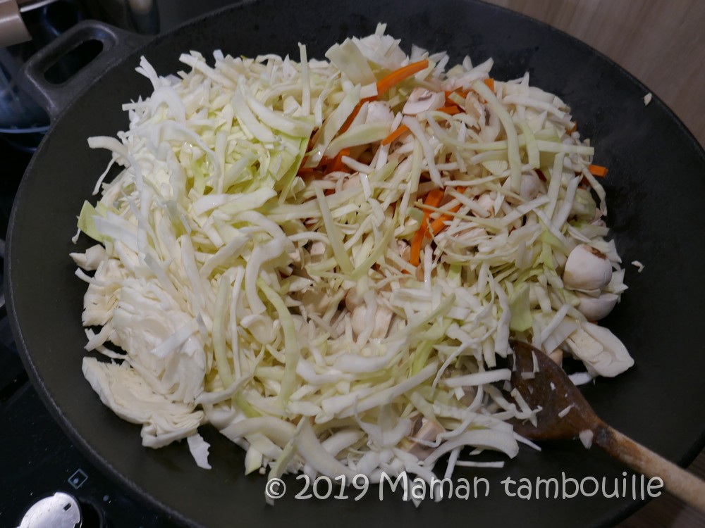 Tailler les carottes et le chou en julienne. Couper les champignons en 4.