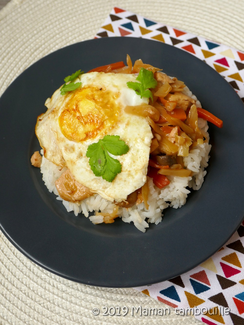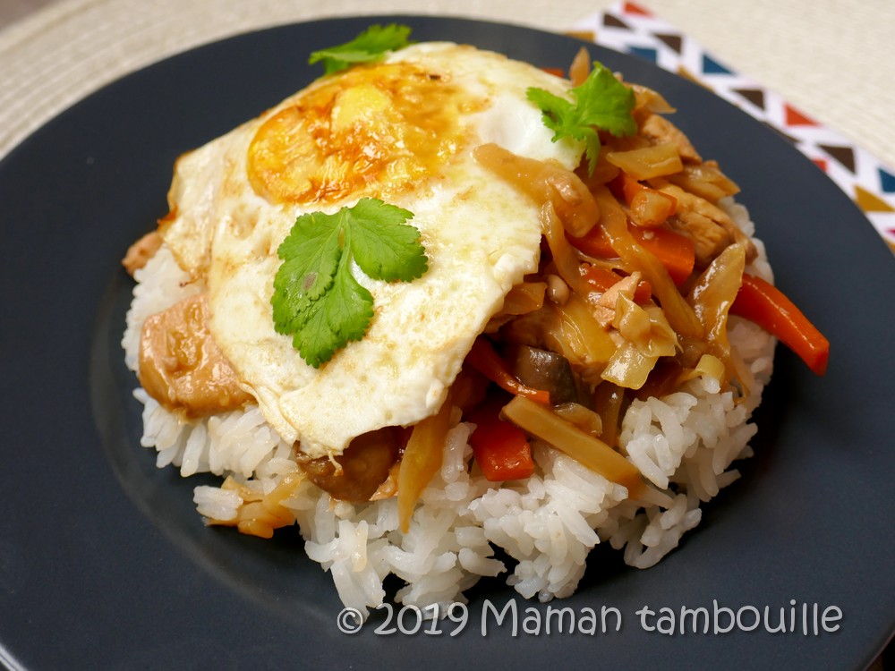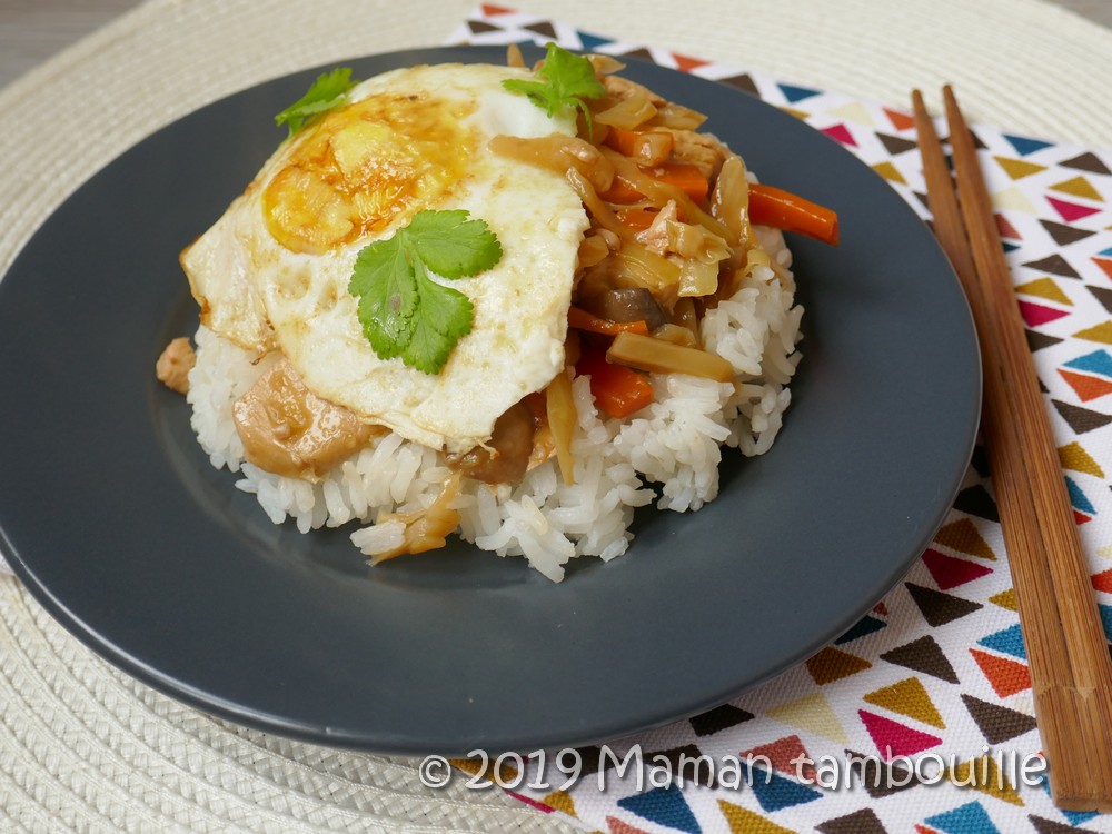 Encore un peu de voyage avec ce « bol renversé », un plat réunionnais ou mauricien aux allures asiatiques constitué de riz, de viande et de légumes et d’un oeuf au plat, le tout servi dans un bol retourné.