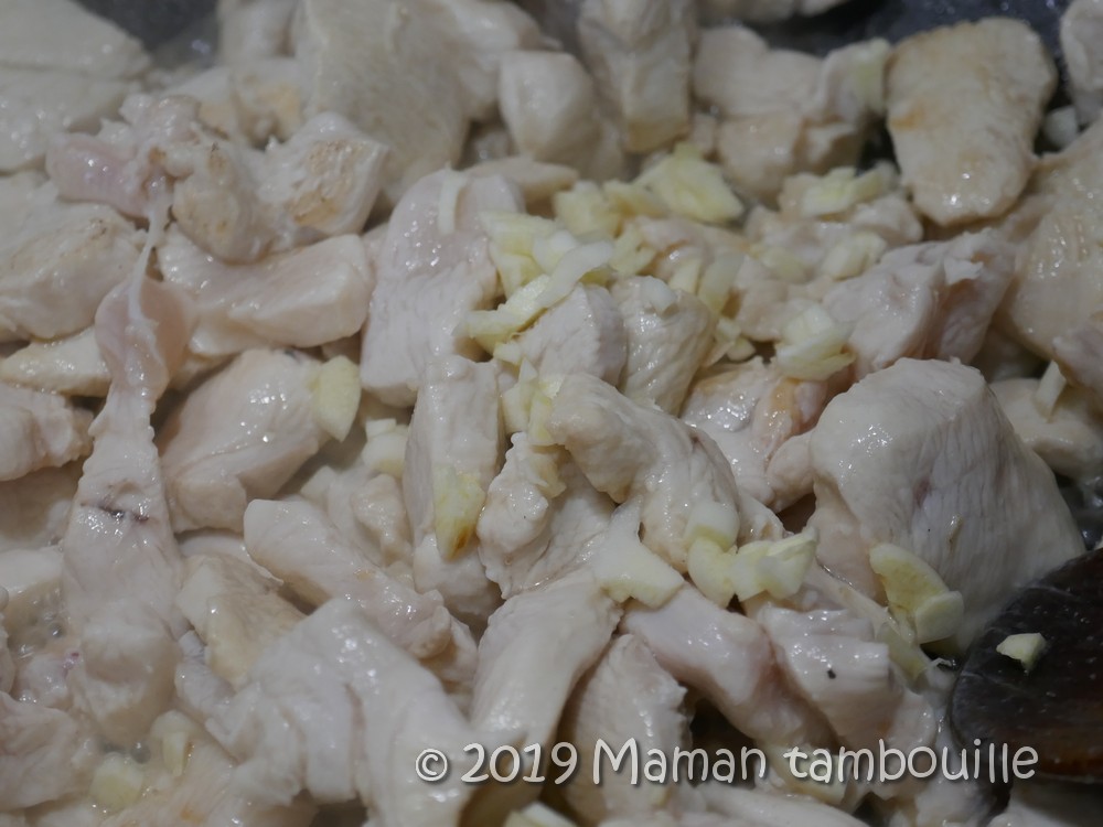 Ajouter l’ail émincé et continuer de cuire le poulet.