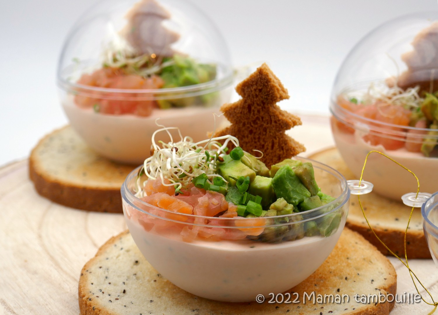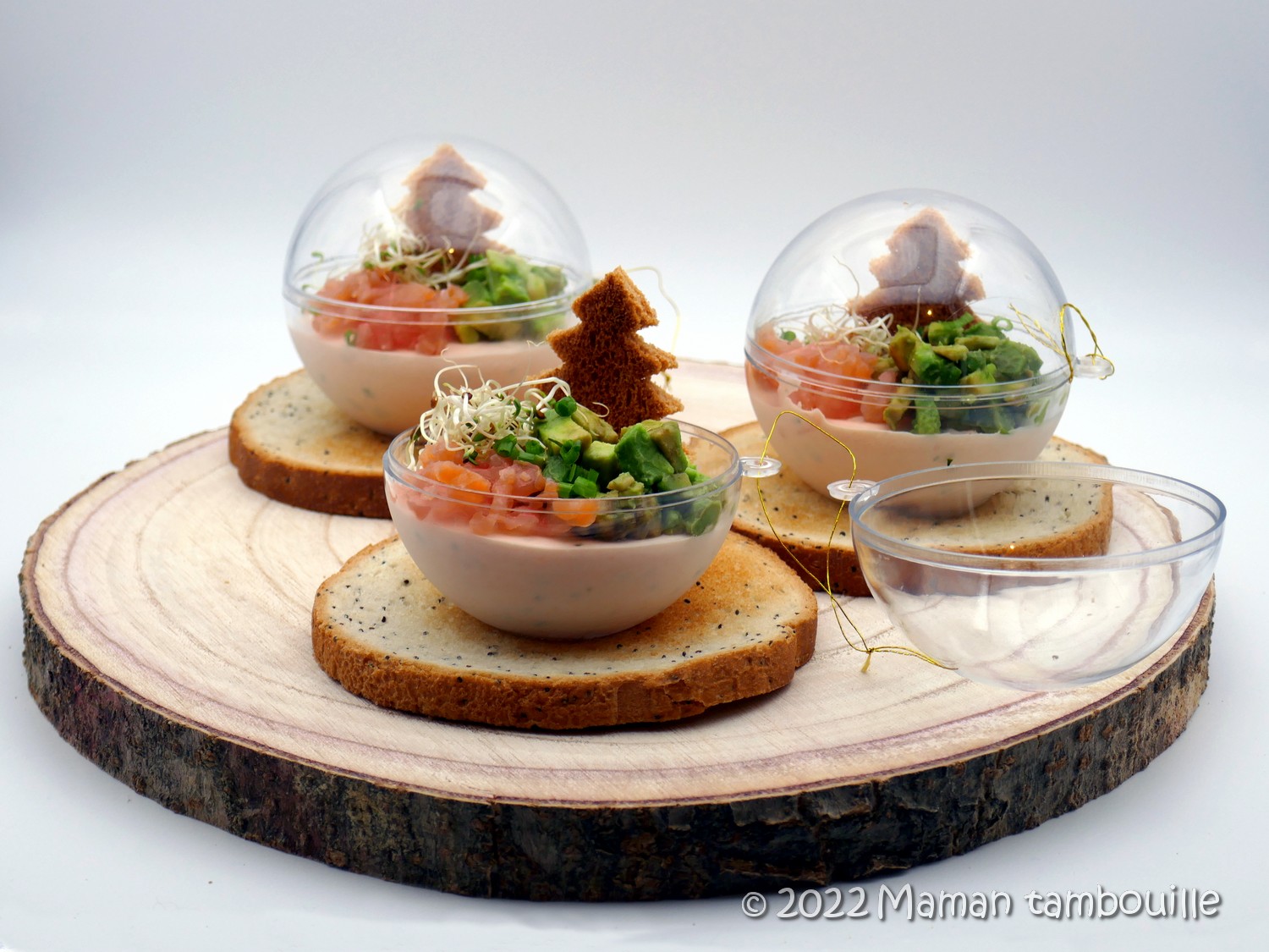 Une entrée de Noël jolie mais simple à réaliser. J’ai utilisé des boules de Noël à garnir que j’ai rempli d’une terrine de saumon frais et fumé. Un petit jeu de patience avec la découpe des petits sapins grillés mais rien de plus compliqué que ça !
