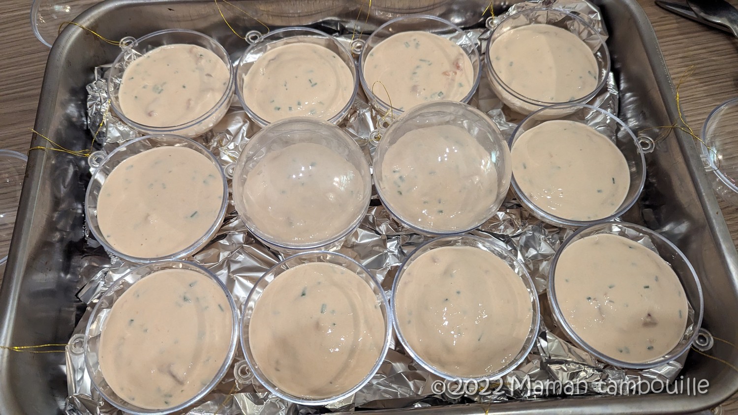 Répartir dans les 12 demis sphères. Faire prendre 2h au frigo.