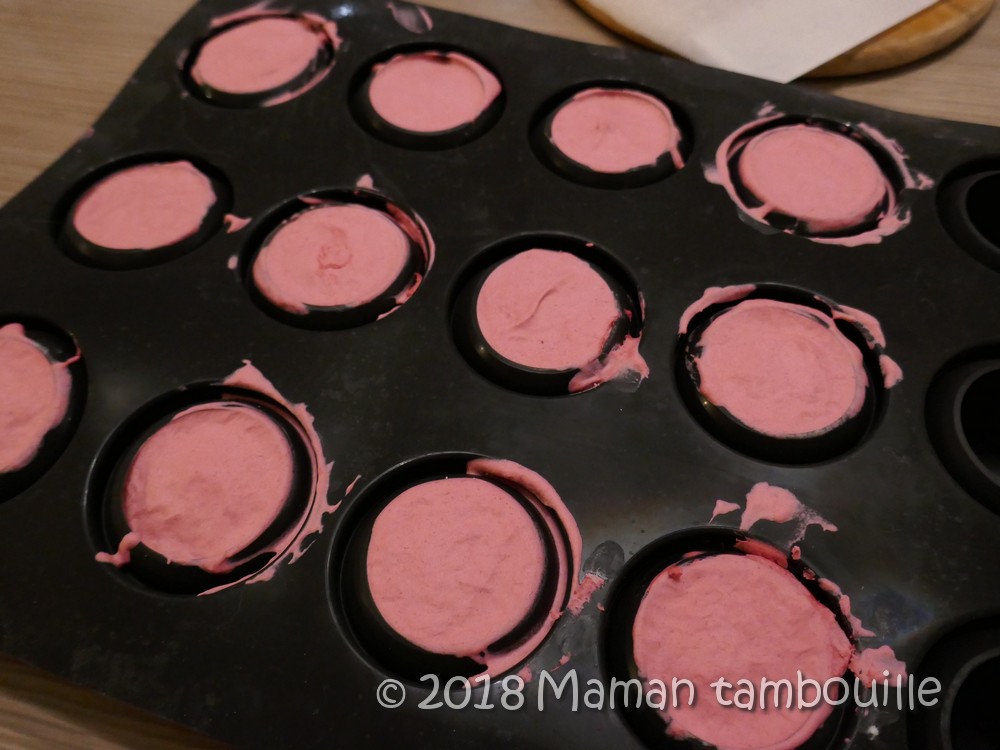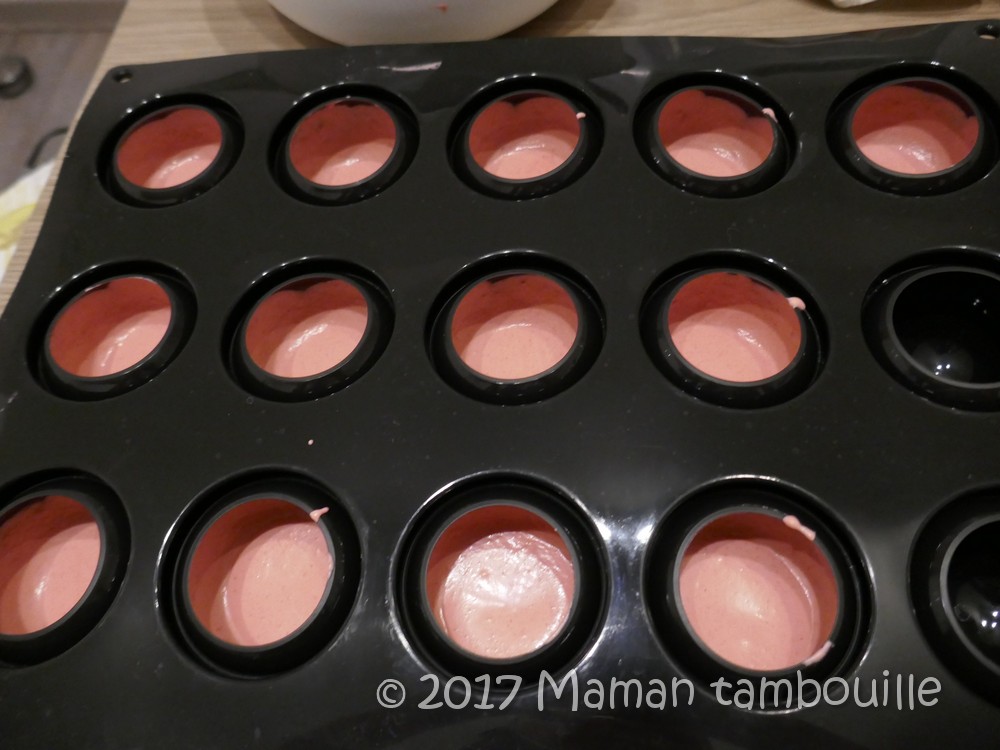 Couvrir avec le reste de mousse de framboise en allant jusqu’au bord des moules.