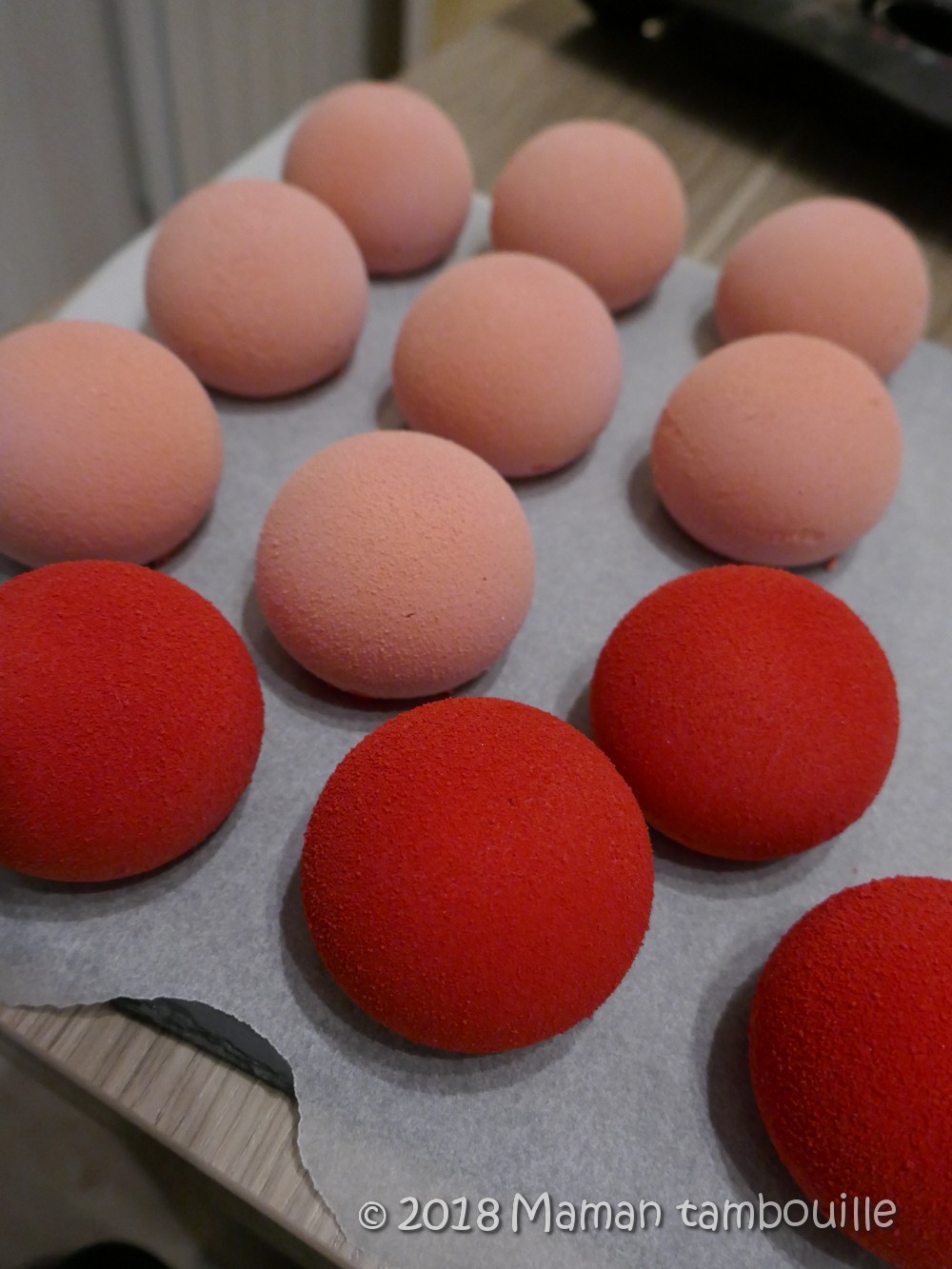Le flocage velours tient très bien au congélateur. On peut donc le réaliser quelques jours avant et remettre les boules au congélateur jusqu’au jour J.