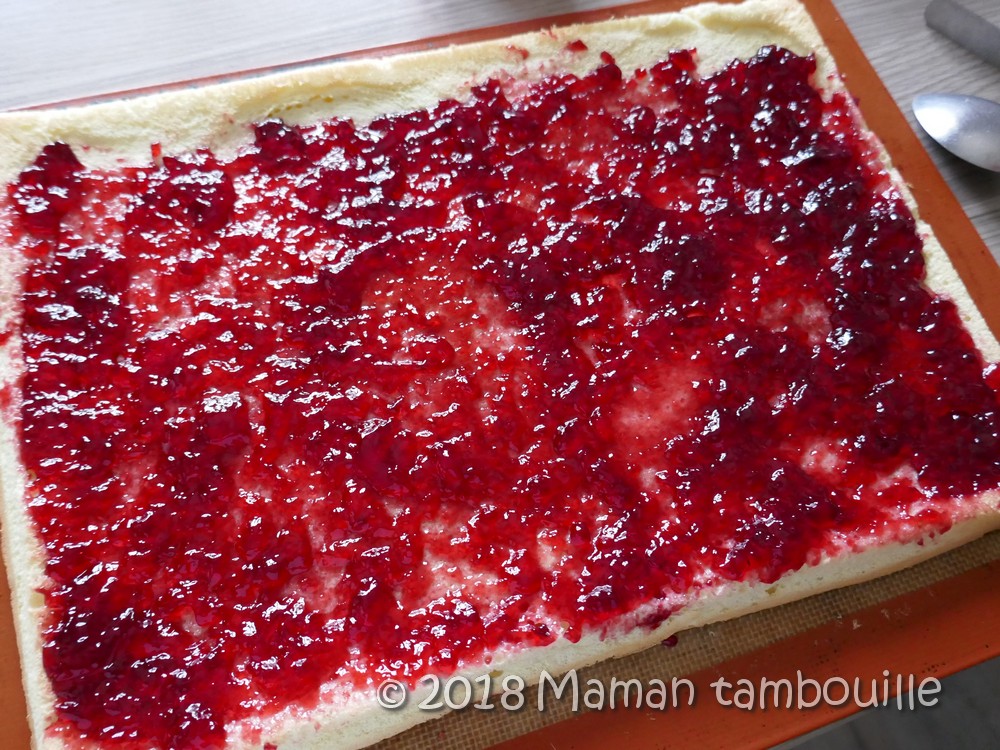 Tartiner aussitôt le biscuit de confiture en veillant à mettre beaucoup moins de confiture sur un des bords les plus longs (ici, tout en haut).