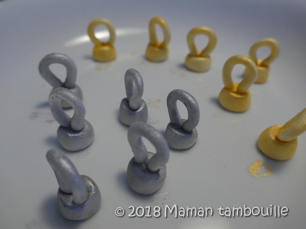 Avec de la pâte à sucre blanche, former les accroches pour les boules de Noël. Les badigeonner de poudre alimentaire dorée à l’aide d’un pinceau.