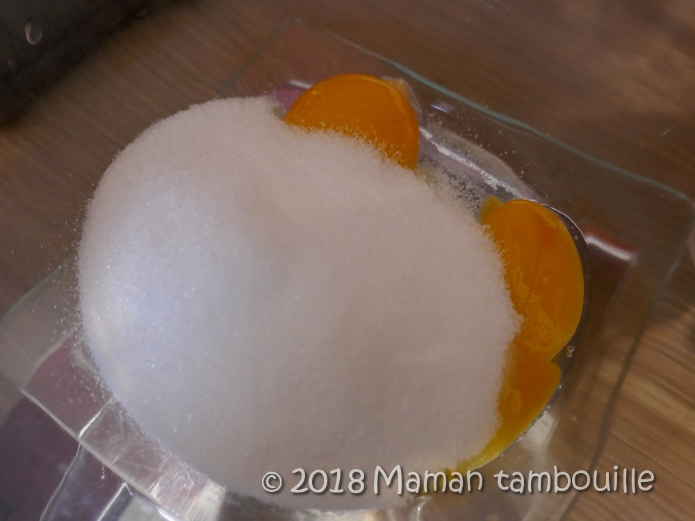 Dans un saladier, casser 2 œufs entiers et ajouter 2 jaunes (garder les 2 blancs à part). Ajouter 80g de sucre.