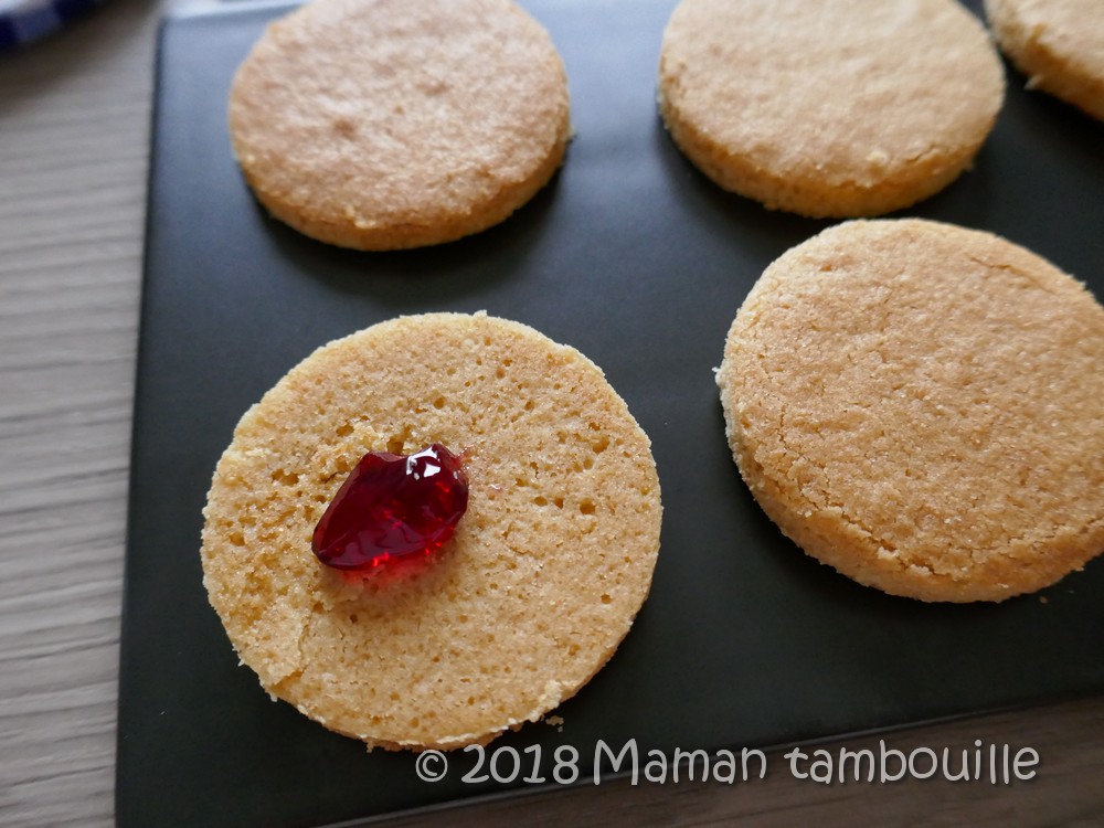Déposer une petite noisette de gelée de framboise sous chaque sablé breton pour les « coller » sur le plat de service.
