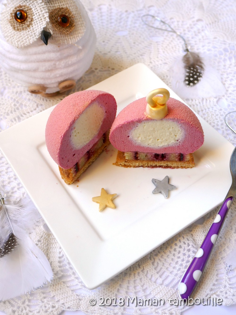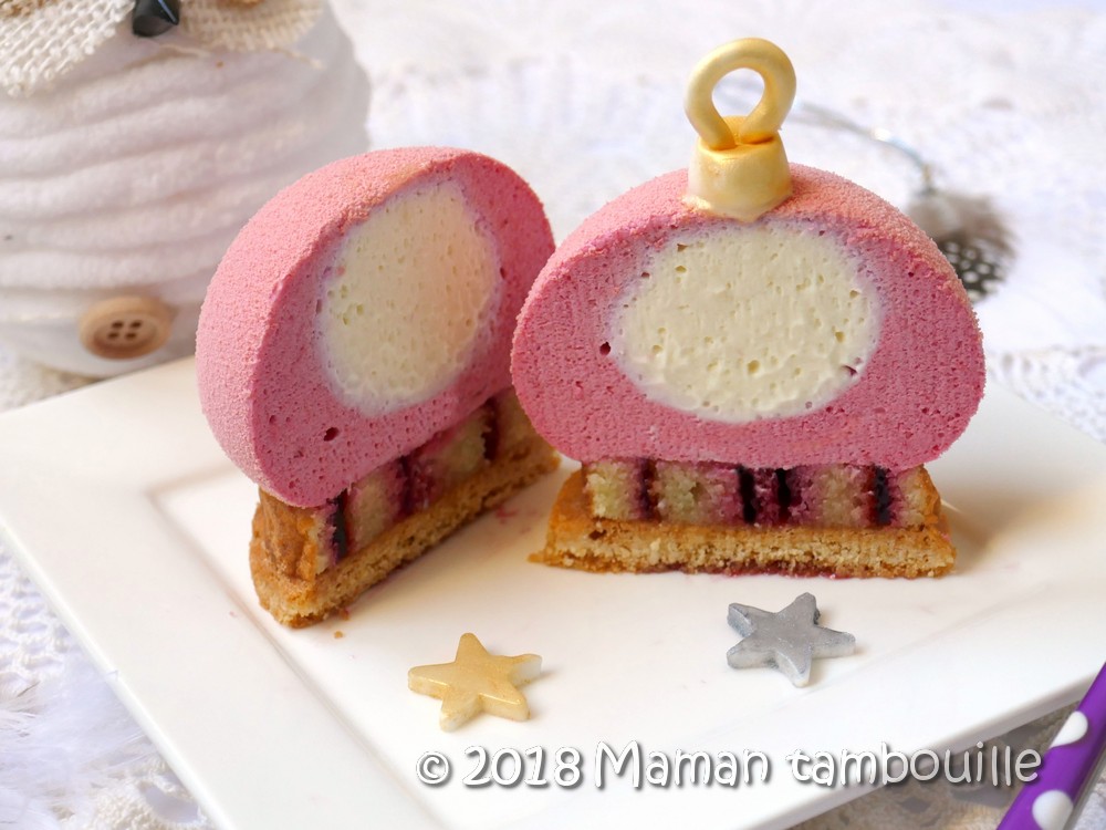 Pour les parfums, je suis partie sur une mousse légère à la framboise avec un insert crémeux au litchi. Pour rappeler l’esprit « bûche de Noël », j’ai déposé les boules sur un gâteau roulé à la framboise coupé en tranche et enfin, un palet breton pour apporter un peu de croquant.