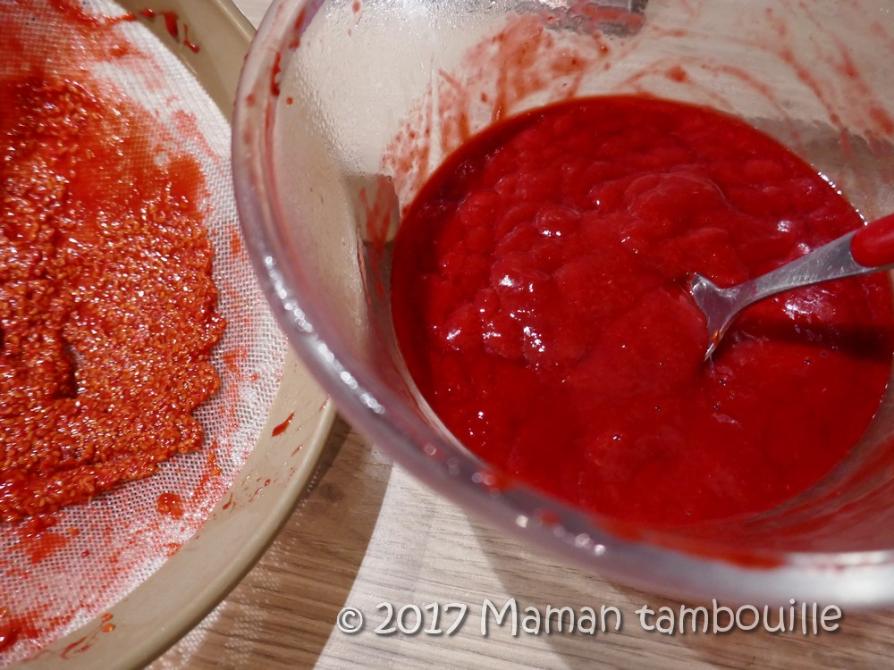 Passer les framboises mixées dans une passoire et écraser pour filtrer les pépins. Garder 250g de pulpe.