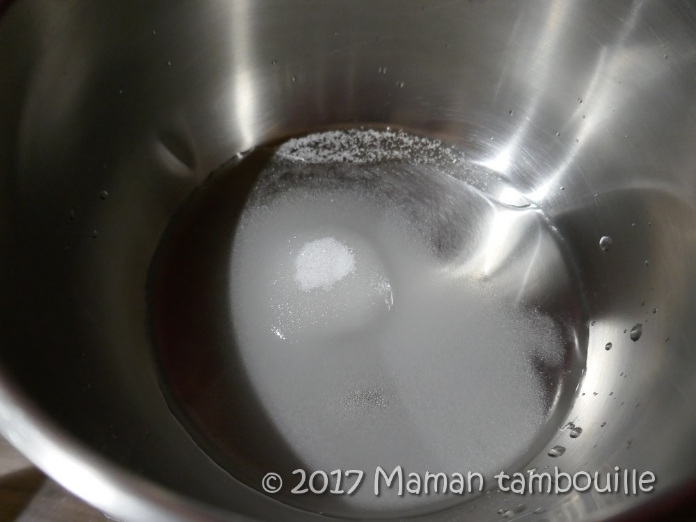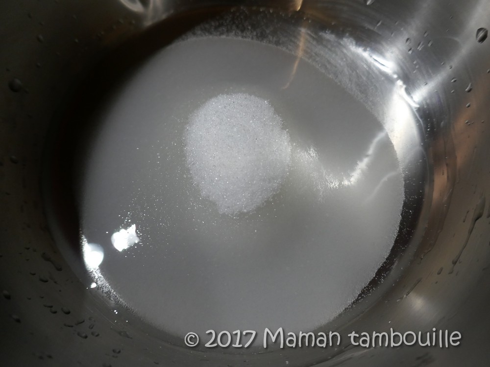 Dans une petite casserole, mettre 20g d’eau et 30g de sucre. Porter à ébullition.