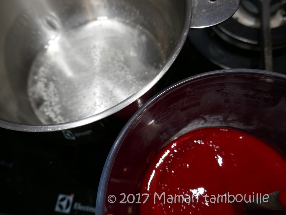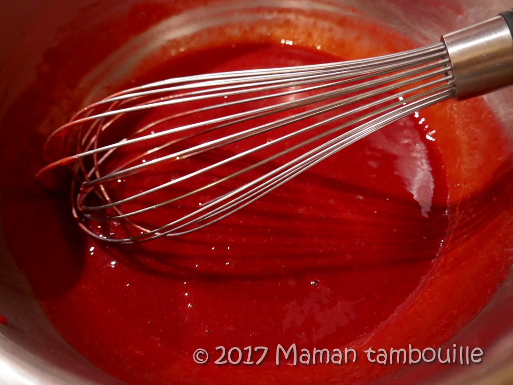 Dès que l’on obtient un sirop transparent, verser dans la pulpe de framboise et bien mélanger. Réserver.