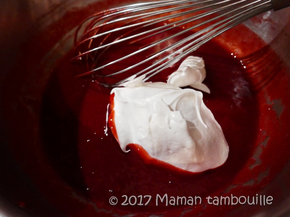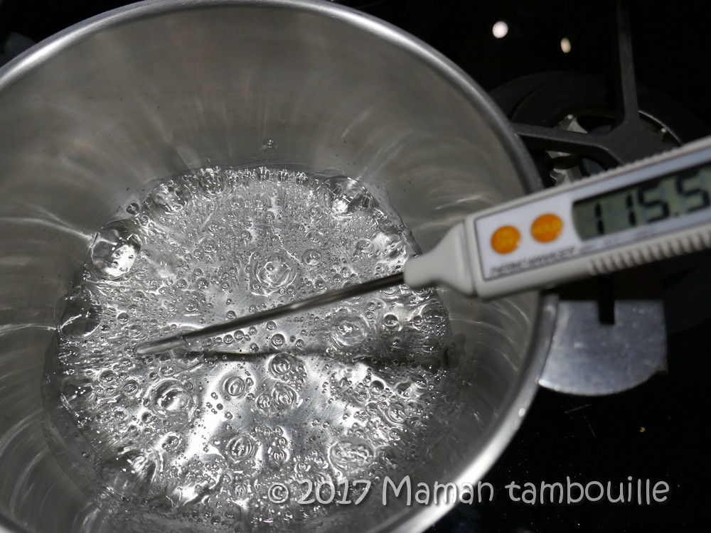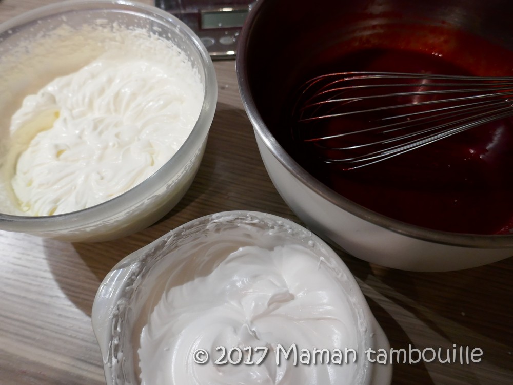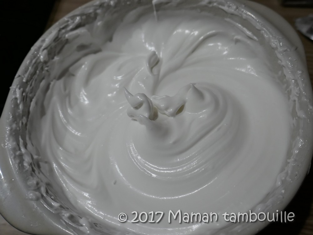 Quand le sirop est à 121°, le verser dans le blanc et continuer de fouetter au batteur jusqu’à ce que la meringue soit quasiment refroidie. Réserver.