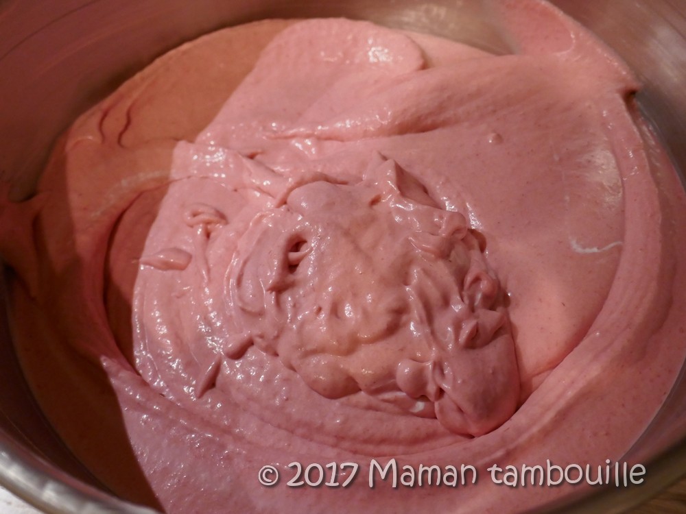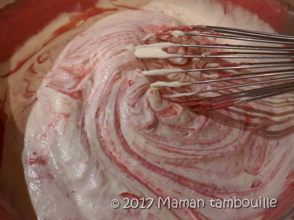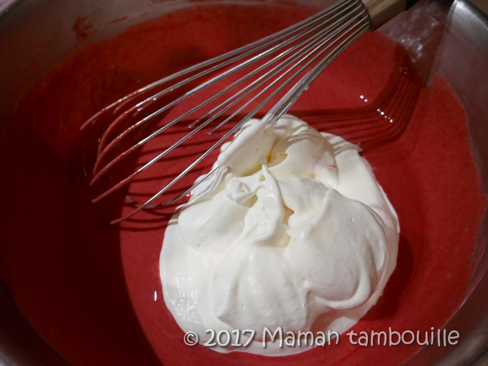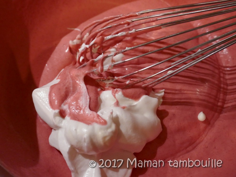 Dans la pulpe de framboise, ajouter la moitié de la meringue italienne.