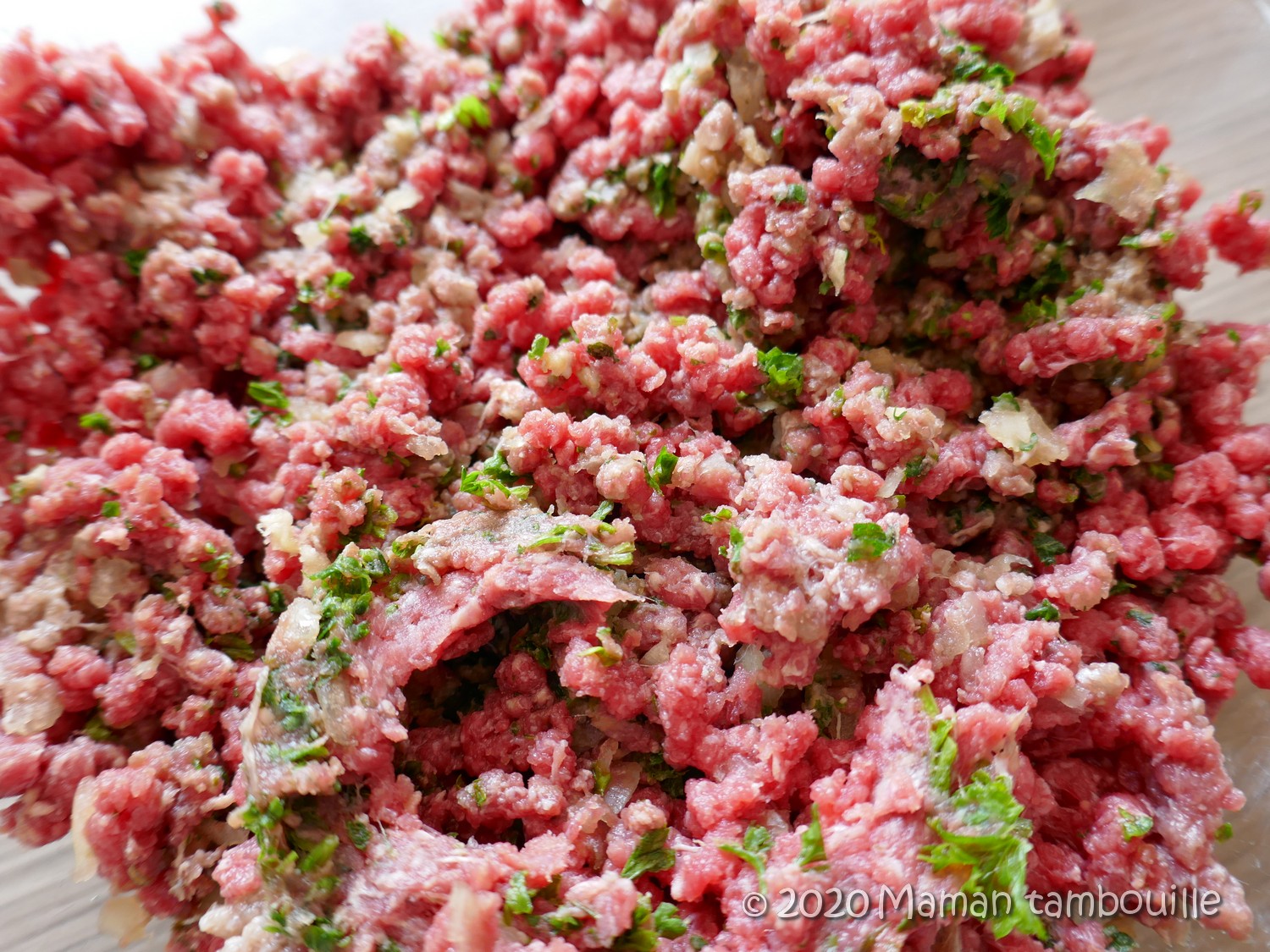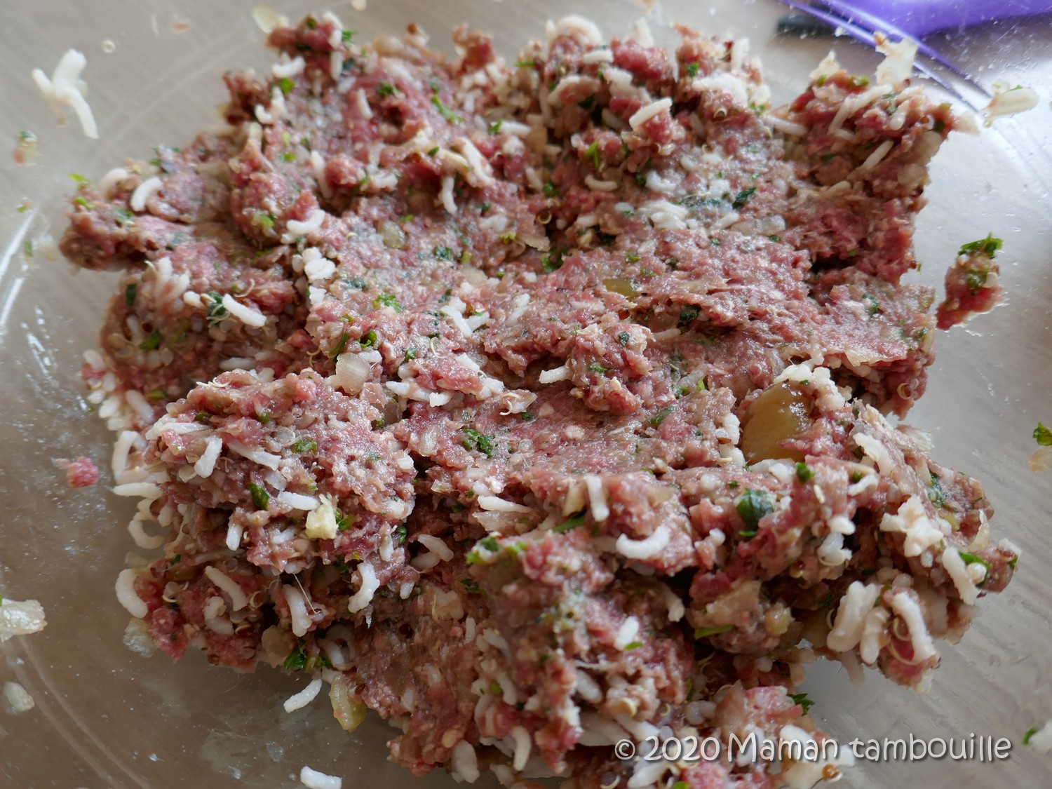 J’ai utilisé le hachoir à viande KitchenAid. Dedans, j’ai passé alternativement le boeuf, l’ail, l’oignon, la menthe et le persil.