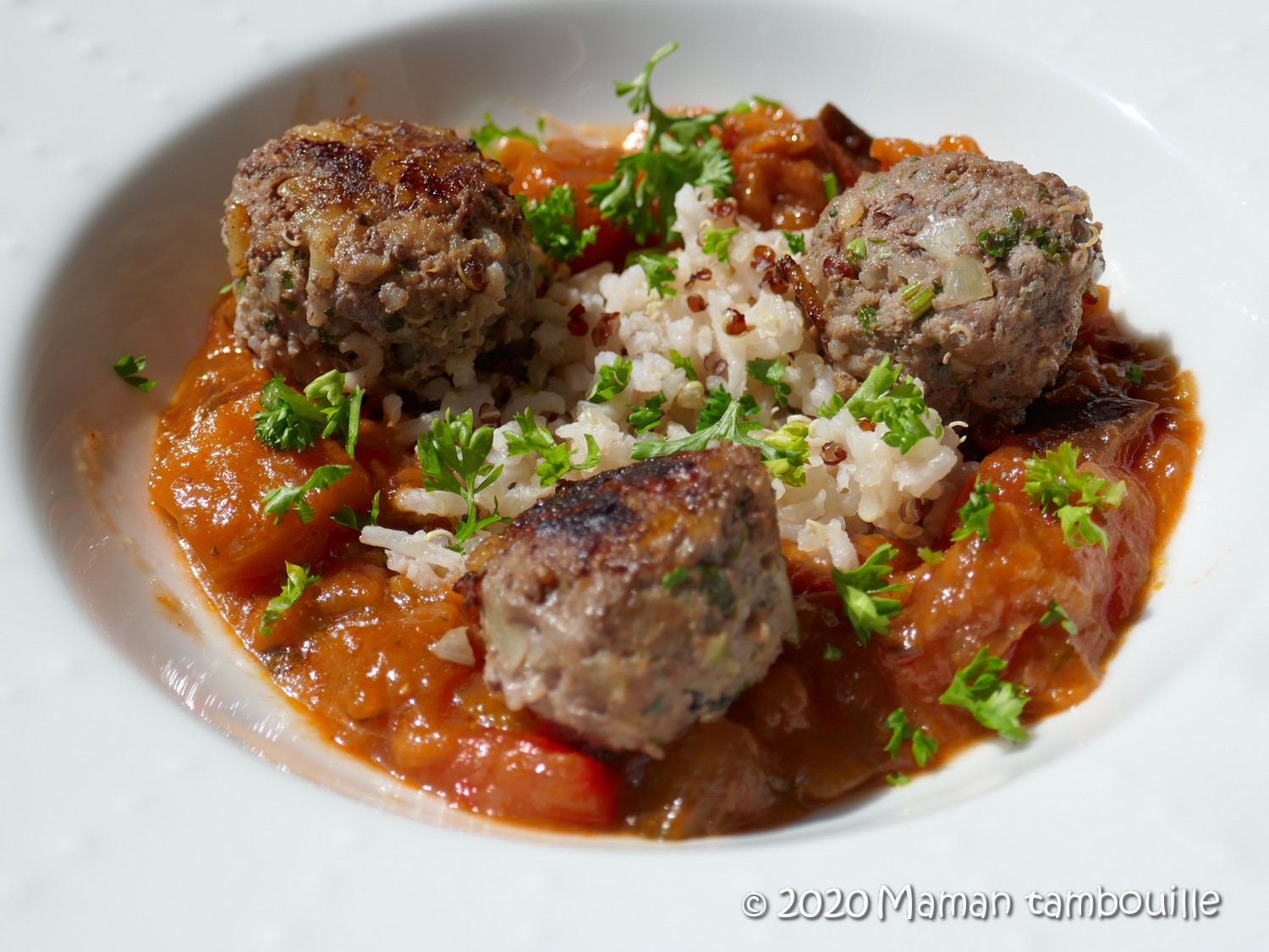 Pour aujourd’hui, je devais recycler un blanc d’oeuf et un bol de riz et quinoa cuit (d’ailleurs je suis en train d’écrire et je ne me souviens plus comment on avait mangé ce riz la première fois … et pourtant, ça ne fait que 2 jours !). Bref, me voilà donc avec mon bol de riz. Un peu de viande avec ça et me voilà à sortir une barquette de boeuf du congélateur. Allez, des boulettes, ici, ça passe toujours. Ce sera boulettes de boeuf au riz, le tout assaisonné de menthe du jardin, persil … Et pour accompagner le tout, un bocal de ratatouille Bio que j’ai dans le placard.