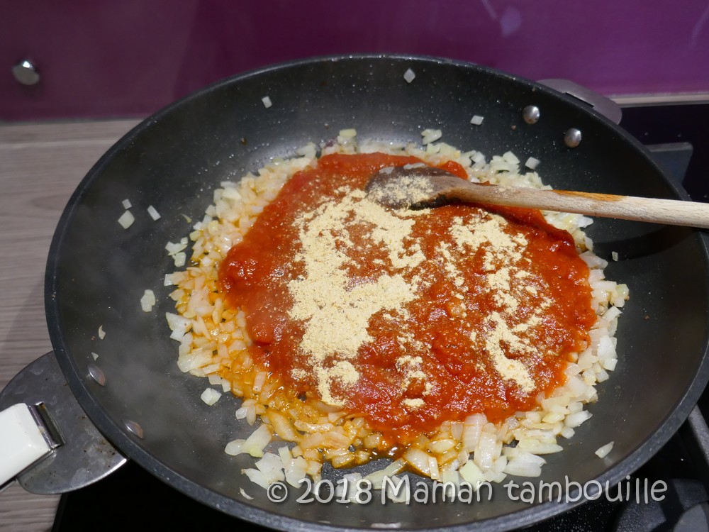 Ajouter la pulpe de tomate, le reste d’épices et un petit verre d’eau. Mijoter 5 min.