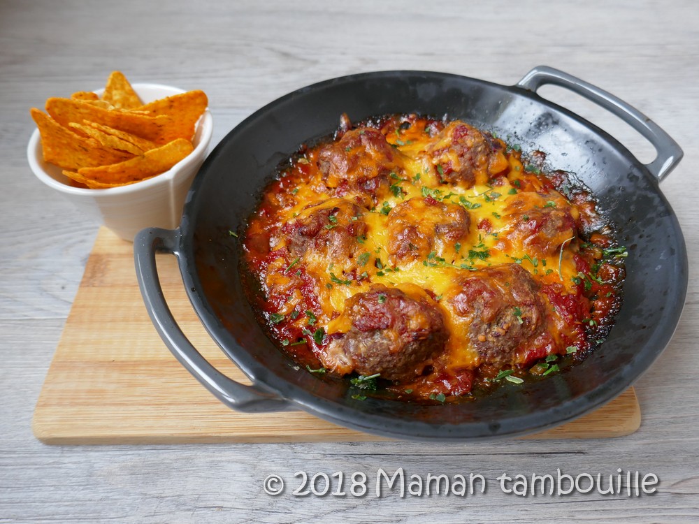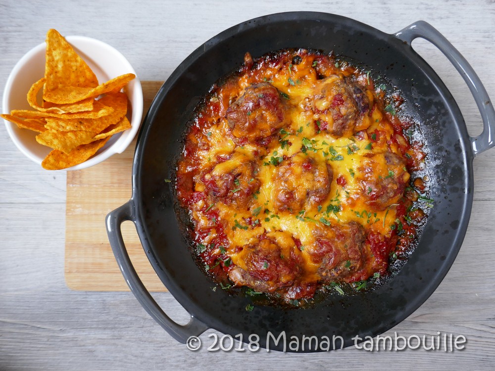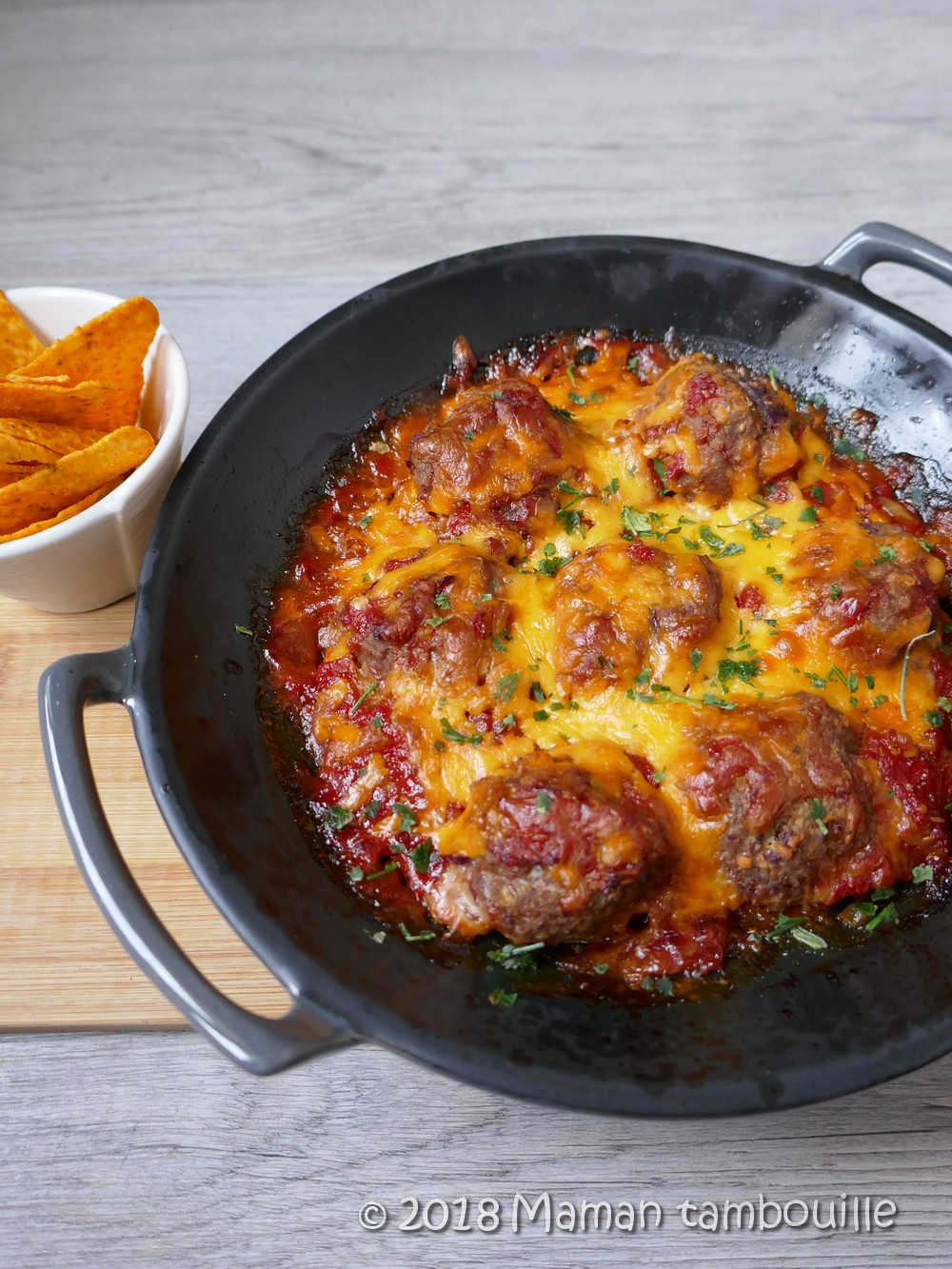 Un plat qui a plu aux enfants, forcément … des boulettes de boeuf aux épices mexicaines à la sauce tomate épicée, le tout gratiné au cheddar et à dévorer avec des chips tortillas.