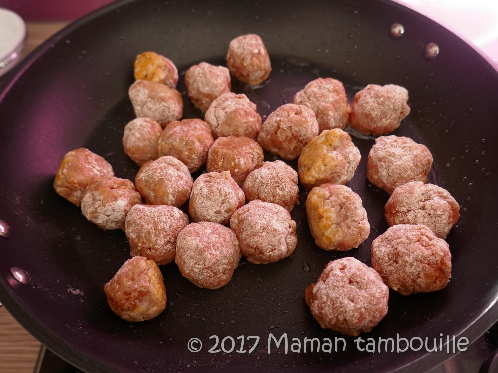 Cuire les boulettes dans une poêle avec 3 cuillères à soupe d’huile.