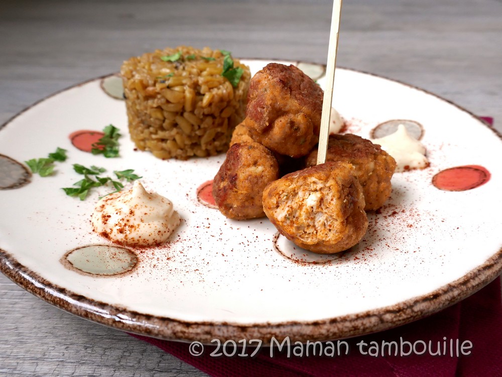 Servir les boulettes bien chaudes avec le risotto et une sauce au choix (sauce kebab pour mes loulous).